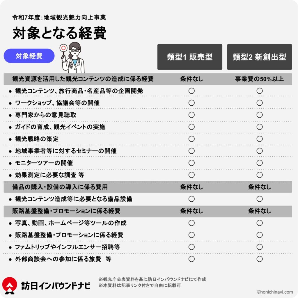 - 観光コンテンツの造成に係る経費:観光コンテンツそのものを作るための経費で、企画開発やモニターツアーの費用も含まれます。(※令和6年度「地域観光新発見事業」の販売型では実施主体の人件費が補助対象でしたが、本事業では類型問わず人件費は補助対象外となるため注意が必要です。(ただし、本事業の取り組みに係る事務を補助するために任用する臨時職員の賃金は補助対象)